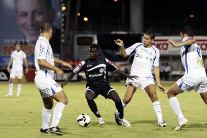 סינטיאהו מנסה להיחלץ מהצבת של הגנת פ"ת (צילום: חגי אהרון)