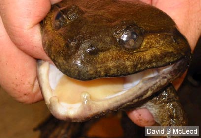 הזכרים גדולים יותר מהנקבות וגם בעלי לסת גדולה יותר, אך הנשק הקטלני של הצפרדעים הם הניבים הגדולים, שמשמשים לא רק ללכידת טרף, אלא מהווים כלי נשק במלחמות בין הזכרים על טריטוריות. החוקרים מציינים כי נמצאו מספר צפרדעים עם ניבים חסרים וצלקות על גופן.