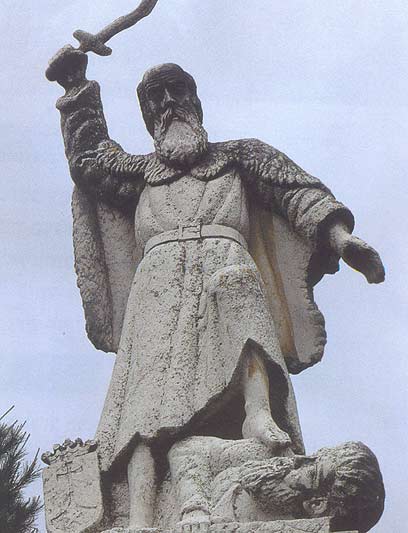 פסל הנביא אליהו, כשלרגליו ראש של נביא בעל (צילום: ארכיון קק"ל)
