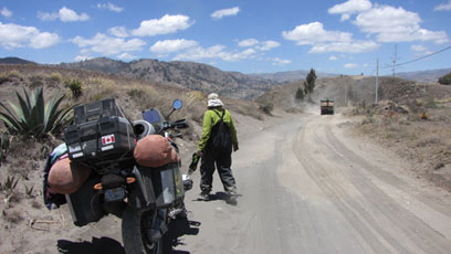 לקראת צהריים הגענו ליציאה מעיר ריובאמבה (Riobamba) נכנסנו למסעדה פשוטה ונקיה וחיסלנו מנה צמחונית ומרק עוף. טוב שהצטיידנו באנרגיה, כי כמו שיצאנו משם נגמר פתאום הכביש ונשלחנו לאיגוף של דרך עפר מאובקת המכוסה בשכבת פודרה, שהיא בעצם רובד אבק בעומק כעשרים סנטימטר עם עליות תלולות.