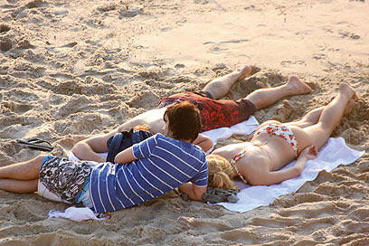 החבורה המצומצמת, שכללה את אאוחניה סוארז, גאסטון גאלמו, אגוסטין סיירה, ניקולס ואסקז והמפיק הצמוד של החבורה (בחולצה כחולה מפוספסת), החלה את הבילוי שלה ברביצה על החוף ושיזוף ישראלי מפנק, עד אשר קלטו את עדשותינו - אז החלו לתור אחר מגבות שיסתירו את הגופות הלוהטים שלהם.