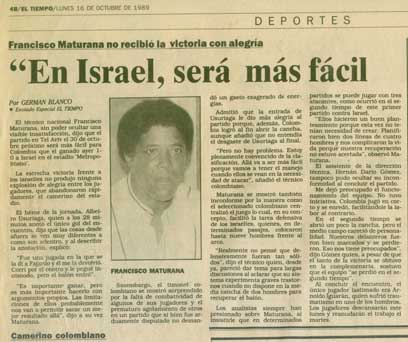 התקשורת הקולומביאנית לא ידעה דבר וחצי דבר על הנבחרת הישראלית. מלבד שמו של אלי אוחנה, אף אחד לא היה מוכר להם. הטבח של הנבחרת, שהיה היחיד במשלחת שדיבר ספרדית שוטפת, סיפר להם ניסים ונפלאות על אוחנה, המסוגל להכריע משחק במהלכי סולו ולהשכיב את היגיטה, כפי שעשה להגנה האוסטרלית, והבטיח שיראו במגרש נבחרת מחשמלת.
