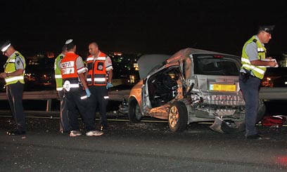 כל הנפגעים הם יושבי הרכב הפרטי. זירת התאונה הערב (צילום: שי וקנין)