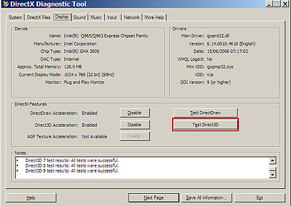 ב. הקליקו על הלשונית Display ואז על הכפתור Test Direct 3D, ופעלו לפי ההוראות.