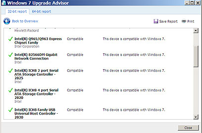 כדי לבצע בדיקה יסודית של כל החומרה שלכם, תוכלו להשתמש בכלי הייעודי Windows 7 Upgrade Advisor. אם אתם מריצים XP כיום, אז כדי להריץ את הכלי ייתכן שתזדקקו גם ל-.NET Framework 2.0 (עוד 22MB). את זה תגלו במהלך ההתקנה.ה-Advisor יציג ניתוח מפורט יחסית של החומרה והתוכנה שלכם ויגיד לכם מה תואם ומה לא. בחלק מהמקרים הוא ידווח על תאימות חלקית ויאמר לכם מה לא תוכלו לבצע (למשל, להריץ את ממשק Aero). במקרים אחרים הוא יפנה אתכם להורדת דרייבר מעודכן, או לאתר המפתח של תוכנה שדורשת עדכון, או פשוט יאמר שאינו יודע.