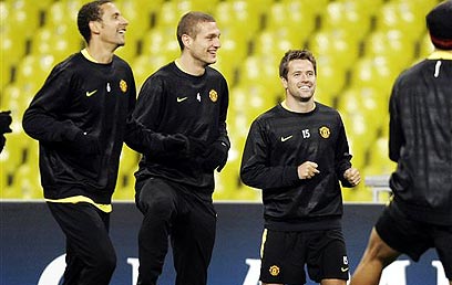 מייקל אואן, נמניה ווידיץ' וריו פרדיננד באימון יונייטד (צילום: AP)
