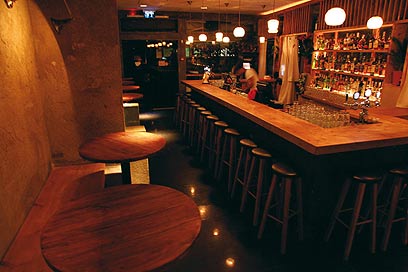 המקום גדול יותר ממה שהוא נראה במבט ראשון, אחרי שעוברים את וילון הבד השחור. יש בו בר גדול שמכיל בנוחות 25 שותים ונחצה במרכזו על ידי מעמד הבקבוקים, כמה שולחנות, קומת גלריה קטנה ומרפסת עם בר משלה. בלי ללמוד שלוש שנים, אני מנחש שהעיצוב הוא מה שמעצבי פנים היו מכנים אקלקטי־מודרני. אבל הוא עובד: הרבה עץ בהיר, תקליטים ישנים על הקירות, תפריטים שמודבקים על ספרי ילדים, קירות צבועים בכחול, קירות מבטון חשוף, קירות מלבנים חומות, אלף מנורות ושעון אורלוגין ליתר ביטחון. במרפסת ניצבים עציצי ענק. ברקע מתנגנת בווליום סביר מוזיקה ישראלית כמו הג'ירפות, שמתחלפת במוזיקה לא ישראלית שאני לא הכרתי, אז בטוח שהיא היתה מגניבה.