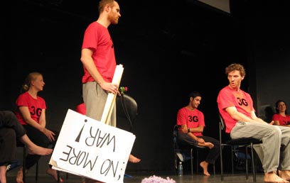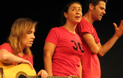 "קח ישראלים, ערבב אותם עם פלסטינים, זרוק פנימה קצת גרמנים ותקבל הצלחה אירופית אדירה במסווה של אמנות", אומרת אחת השחקניות, במופע שבו החוץ והפנים מתערבבים כל הזמן והבדיחה היא תמיד עליך.