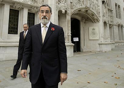 הרב הראשי הבריטי, ג'ונתן סאקס, בצאתו מהדיון, היום (צילום: AP)