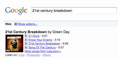 ענקית החיפוש גוגל מקשרת ישירות להאזנה לשירים או לרכישתם באמצעות חיפוש אלבום, אמן, שיר או מילים ממנו - אך השירות זמין בארצות הברית בלבד
