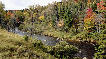 עצים בקרבת נהר Ausable. השלכת יוצרת מרבד אדמדם של עלים