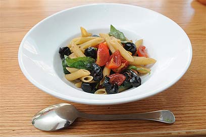 פסטה קצרה עם עגבניות שרי, זיתים, בזיליקום ושמן זית