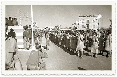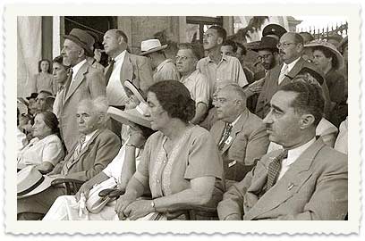 16. ב- 7 באוגוסט 1949 התקיימה נסיעת רכבת ישראל הראשונה לירושלים. בטקס בירושלים נראים מימין: דב יוסף (שר האספקה והקיצוב, שמונה אחראי על יישומה של מדיניות ה"צנע"), גולדה מאיר, פולה ודוד בן גוריון