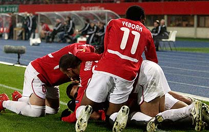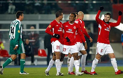 הפועל ת"א חוגגת ניצחון ענק בווינה (צילום: רויטרס)