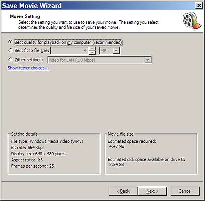 ב-Movie Maker יש מצבים מוכנים, שכוללים את רוב ההגדרות הדרושות, וניתן לבחור ביניהם באמצעות אשף (היכנסו ל-File / Save Movie File ובחרו באפשרות הראשונה). רק שימו לב שמצב ברירת המחדל (Video for Broadband) ישמור את הסרטון באיכות נמוכה. שימו לב למידע על מאפייני שמירת הקובץ במסגרת "Settings Detail" מצד שמאל.