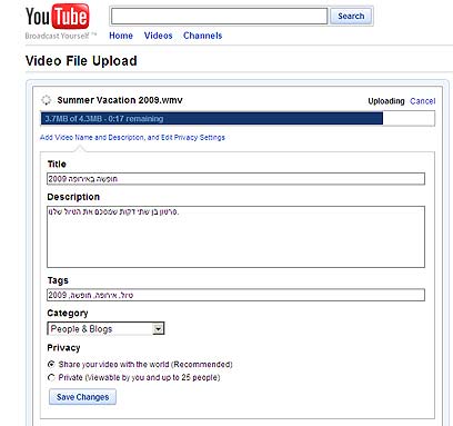 אחרי שתבחרו בקובץ ותקליקו על "פתח", תועברו לדף Video File Upload. בראש הדף, תוצג ההתקדמות בהעלאת הסרטון, ובמקביל תוכלו להזין פרטים עליו בשדות המתאימים.