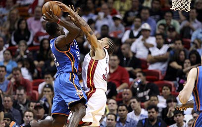 והיו גם הפתעות במשחקי הלילה. ברבע השני ברחו הת'אנדרס ליתרון דו-ספרתי, אך עד למחצית צימצמו ההיט ל-45:42. מיאמי התקרבה לנקודה עם תחילת הרבע השלישי, אך אוקלהומה לא ויתרה ופתחה שוב פער שנשמר עד לסיום. לאוקלהומה (5:6): קווין דורנאט 31 (9 ריבאונדים), ראסל ווסטברוק 24 (7 אסיסטים). למיאמי (3:7): דוויין וייד 22 (6 ריבאונדים ו-7 אסיסטים), ג'רמין אוניל 19 (10 ריבאונדים).