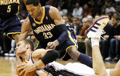 לופס מחבק את הכדור, גריינג'ר מהפייסרס נאבק (צילום: AFP)