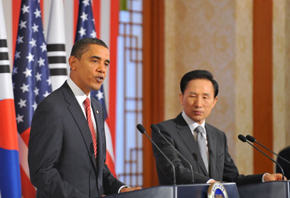 משתפים פעולה. לי ואובמה בסיאול (צילום: AP)