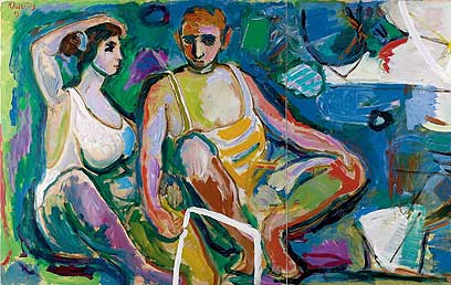 סך הכל, הציורים שלו נגישים מאוד, קל לאהוב אותם, אבל אני לא רואה את השילוב של המופשט עם הפיגורטיבי כסוג של הקלה או הליכה לקראת הקהל. דווקא יש בדבר משהו מאתגר: הניגוד שבין הצורות המזוהות לנו כאנושיות, או דומות לנוף כלשהו, לבין כתמי הצבע שאינם מסמלים דבר, מאמץ את הראש ובעיקר את הלב.