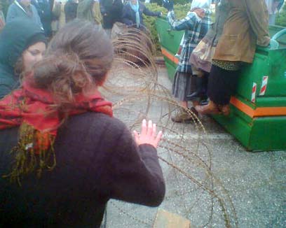 מיכל זבל ובנות אולפנה חוסמים את פקחי ההקפאה, הבוקר במעלה לבונה (צילום: אפרת וייס)