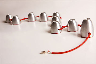 מיה פיזוב עיצבה גם חנוכיה בהשראת צמידי הקבלה שהפכו כבר לסמל אופנתי בשילוב בתי נר עשויים יציקת אלומיניום שקשורים זה לזה בשרוך אדום ומזכירים תליוני מזל.