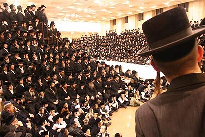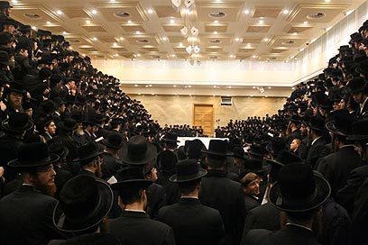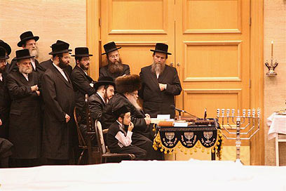 9. אלפי חסידים בחסידות בעלז מצטופפים כדי לראות את האדמו"ר מברך על נרות החנוכה