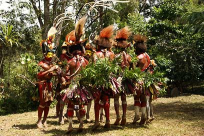 הגברים ענדו על החזה בהצלבה שרשראות ארוכות של זרעים אדומים (זרעי Everlasting) משולבים בקונכיות לבנות. לצווארם ענדו שרשראות צבעוניות נוספות, מחרוזות של קונכיות, כשעל הגב מושחלים חטי חזיר ומקור גדול של העוף מקור-הקרן (Hornbill). את צווארם הקיפו במחרוזת מהשדרה השחורה של נוצת הקאסווארי הארוכה (Quill of Cassowary). לזרועותיהם ענדו הגברים חבקים קלועים מקנה, בתוכם נעצו עלים ירוקים טריים.