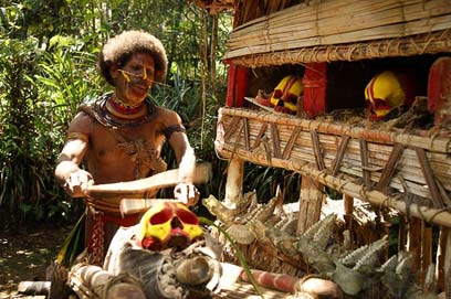 הגולגלות צבועות בצהוב ואדום. תומאס הסביר לי שכאשר שואלים את מגיד העתידות שאלה, הוא אוחז באצבע אחת בכל יד במוטות במבוק, שעליהן מונחת גולגולת ועצמות עטופות בעלי בננה, ועונה בהתאם לזרמים שהוא חש בידיו. מגיד העתידות האיץ בי לשאול שאלה, וסיפר שלפני חצי שנה היה אצלו זוג תיירים שרצה בילד. מגיד העתידות אמר להם שהאישה תהיה בהריון אחרי ארבעה חודשים, וכך היה. השאלה היחידה שעלתה בראשי היתה, האם הנסיעה שלי בתחבורה ציבורית ממאדאנג (Madang) לגורוקה (Goroka) תעבור בשלום. מגיד העתידות ביצע את הטקס, וענה שכן (וכך גם היה).