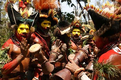 בני שבט ההולי מנגנים בתופי קונדו במופע סינגסינג בטארי