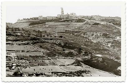 3. מורדות הר ציון, צילום מראשית המאה ה-20. על ההר נמצאת בבנייה כנסיית דורמציון-מגדל הפעמונים. השטח ניתן לקיסר גרמניה וילהלם השני