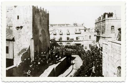 * הסבר לתמונת צד ה': 11 בדצמבר 1917, טקס כניסת הגנרל סר אדמונד אלנבי לירושלים דרך שער יפו. את מגדל השעון הנראה מעל השער בנן הטורקים רק חמש שנים קודם לכן, לרגל 30 שנות שלטון הסולטן עבדול חאמיד השני. ב-1922 הורה מושל ירושלים הבריטי, רונלד סטורס, להסיר את השעון
