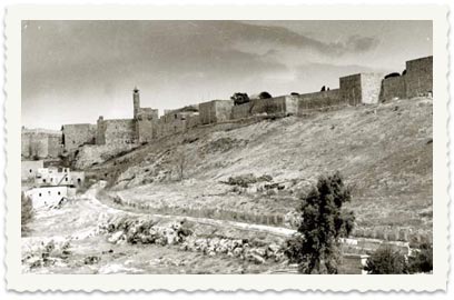19. חומת העיר ירושלים, והדרך לשער יפו שבה צמחו קוצים - לפני מלחמת ששת הימים. "ואין עולה להר הבית..."