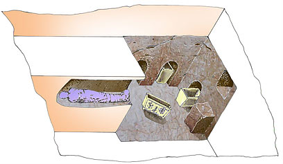 שרטוט של המערה שבה נתגלתה הגופה (איור: פרופ' שמעון גיבסון)