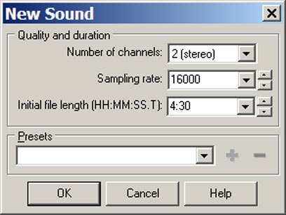 ההסבר הארוך, למי שרוצה לעשות את זה כמו שצריך: בשלב ראשון, כדאי לבצע בדיקה ולראות שאתם ערוכים להקלטה (ראו ההסבר תחת הכותרת "למה לא מקליט לי?" בהמשך). בשלב הבא, מריצים את התוכנה (כאמור, GoldWave) ויוצרים קובץ חדש (File / New). בחלון שיופיע תוכלו לבחור את מספר הערוצים (מונו/סטריאו), קצב הדגימה (Sampling rate) ואת האורך המקסימלי.