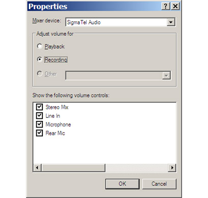 כדי לבדוק ולתקן היכנסו ל-Volume Control באמצעות קליק ימני על אייקון הרמקול ב"מגש המערכת" או דרך לוח הבקרה (Sound and Audio Devices / Volume Advanced). היכנסו ל-Options / Properties, סמנו את האופציה Recording ואז את כל התקני האודיו בחלונית התחתונה, ואשרו.