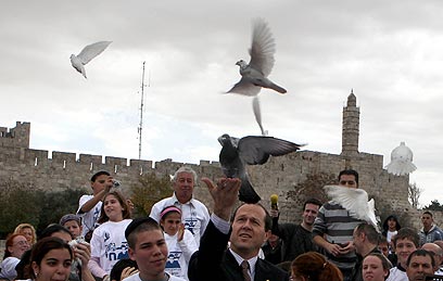 ראש העיר ברקת באירוע הפרחת יונים למען שליט, היום בי-ם (צילום: AFP)