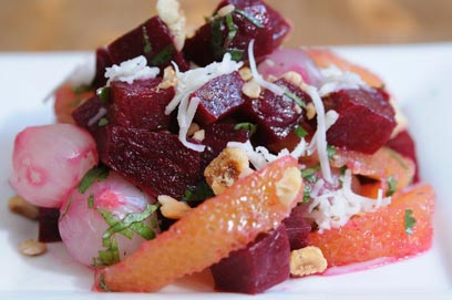 סלט סלק צלוי עם תפוזים, שמן אגוזים ובצלצלי פנינה