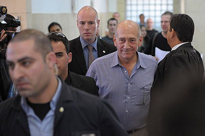 אולמרט מגיע לבית המשפט, היום (צילום: גיא אסיאג)