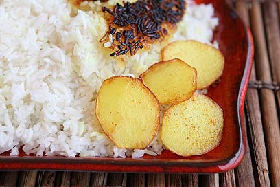לפעמים נדמה לי שהאורז מהווה רק תירוץ להכנת טהדיג, והאמת איך לא? מדובר במצע של תפוחי אדמה זהובים ורכים שכולם רבים עליהם, כי אף פעם אין מספיק. יש היררכיה מאוד ברורה בחלוקת השלל. קודם כל האורחים ואחר כך כל השאר, חוץ מאחותי הצעירה שהחליטה מזמן שהכלל הזה לא חל עליה. באופן קבוע היא מתנדבת ראשונה לעזור לאמא להגיש את האורז, ומהמטבח עד השולחן נעלמים במסתוריות משונה כמה תפודים.