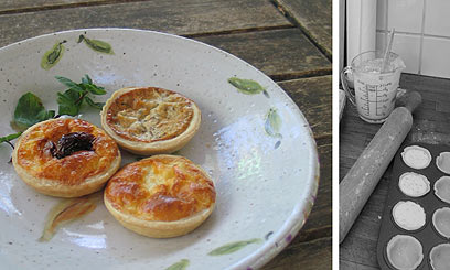 בצק פריך מלוח במילוי פטה ועשבי תיבול בתבניות קיש אישיות. אפשר להוסיף לו מחית זיתים (שחורים טחונים דק), חצילים, פטריות, קישואים, עגבניות מיובשות, בטטה ועוד