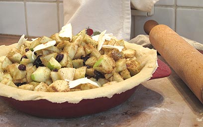 - מחלקים את הבצק לשני חלקים שווים. על משטח מקומח, מרדדים אותם לשני עיגולים, בקוטר של 3 ס"מ יותר מגודל התבנית. מניחים חלק אחד של הבצק בתבנית פאי, משאירים מעט שוליים מחוץ לתבנית. מניחים את המילוי בגבעה ומפזרים מעל שבבי חמאה קרה. מכסים עם החלק השני של הבצק. סוגרים ומהדקים את שולי הבצק זה לזה.
