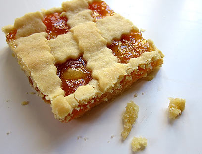 - מניחים בתבנית פאי ומחוררים בעזרת מזלג. מורחים בשכבה דקה של קונפיטורת משמשים.