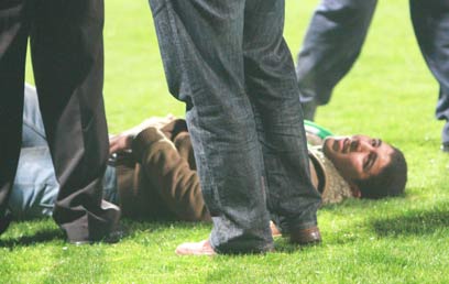 אוהד פצוע של נצרת מוטל על הדשא (צילום: חגי אהרון)