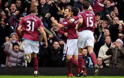 שחקני ווסטהאם חוגגים את השער הראשון (צילום: גטי אימג'ס)