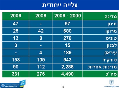 על פי הנתונים שהוצגו, ממדינות ברית המועצות לשעבר ומזרח אירופה היגרו ארצה בהתאם לחוק השבות 7,120 עולים לעומת 5,867 ב-2008 (גידול של 21%); מארצות דוברות אנגלית (ובהן צפון אמריקה, בריטניה, דרום אפריקה, מדינות אוקיאניה ואחרות) כ-5,300 עולים לעומת 4,511 (17% יותר);