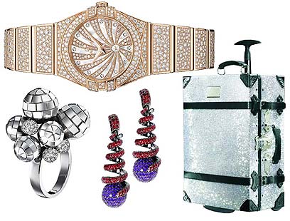 מזוודה של סמסונייט, 10,000 אירו; עגילים של JB תכשיטנים, 185,000 שקל; טבעת של פיאג'ה, 42,630 שקל; שעון של אומגה, 450,000 שקל (צילומים: סטפנו גווינדני, נועה נבון, קרן קיש)