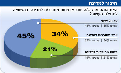בפרוס 2010, עם ישראל מרגיש פחות מלוכד. 69 אחוזים מהנשאלים בסקר סברו כי חלה ירידה בלכידות החברתית, לעומת 14 אחוזים בלבד שחשו שהחברה יותר מלוכדת ו-17% שסבורים כי לא חל שינוי בתחום. למרות שהם פחות מלוכדים, 34 אחוזים מהישראלים מרגישים יותר מחוברים למדינה, בהשוואה לתחושתם בשנת 2000. בקרב הציבור הדתי מחד ובקרב אנשי שמאל, תחושת החיבור נחלשה יחסית יותר בעשור האחרון. לעומת הצברים והעולים הוותיקים, העולים החדשים מרגישים יותר מחוברים למדינה.