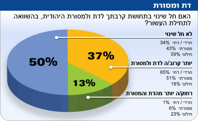 37 אחוזים מהישראלים חשים קרובים יותר לדת ולמסורת היהודית, 13 אחוזים התרחקו מהדת, אבל בקרב כמחצית מהאוכלוסייה לא נרשמו תנודות בקשר עם אלוהים. חילונים, בעלי רמת השכלה והכנסה גבוהות ובעלי השקפת עולם הנוטה לשמאל, מתקרבים פחות ואף מתרחקים מהדת ומהמסורת. בקרב החרדים והמסורתיים, העידו 65% ו-51% בהתאמה על התקרבות לדת ולמסורת, לעומת 18 אחוזים מהחילונים.
