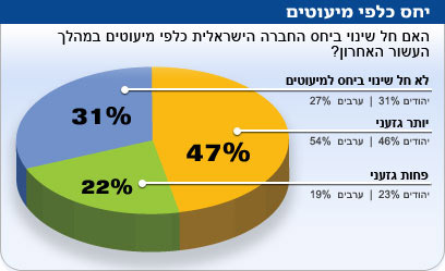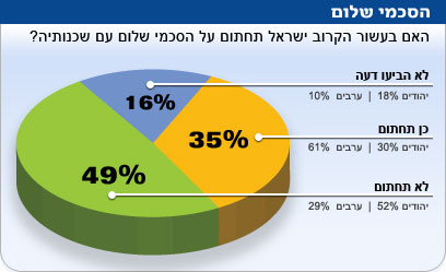 אחרי מלחמה, מאות מבצעים צבאיים ופעולות טרור ופחות או יותר אפס הסכמי שלום, נראה שהתרגלנו. 39 אחוזים סבורים כי המצב הביטחוני ישתפר, 35% בטוחים שהוא יורע ו-26 אחוזים חושבים שלא יחול שינוי. 35 אחוזים חושבים שישראל תחתום בעשור הקרוב על הסכם שלום עם אחת משכנותיה, 65 אחוזים חושבים שזה לא יקרה, ו-16% לא השיבו. 61 אחוזים מהערבים סבורים שיהיה שלום, ו-43% סבורים שהמצב הביטחוני ישתפר. 29% מהאזרחים הערבים חושבים שלא ייחתם הסכם שלום נוסף, אבל 30 אחוזים מהם חושבים שלא יחול שינוי המצב הביטחוני.